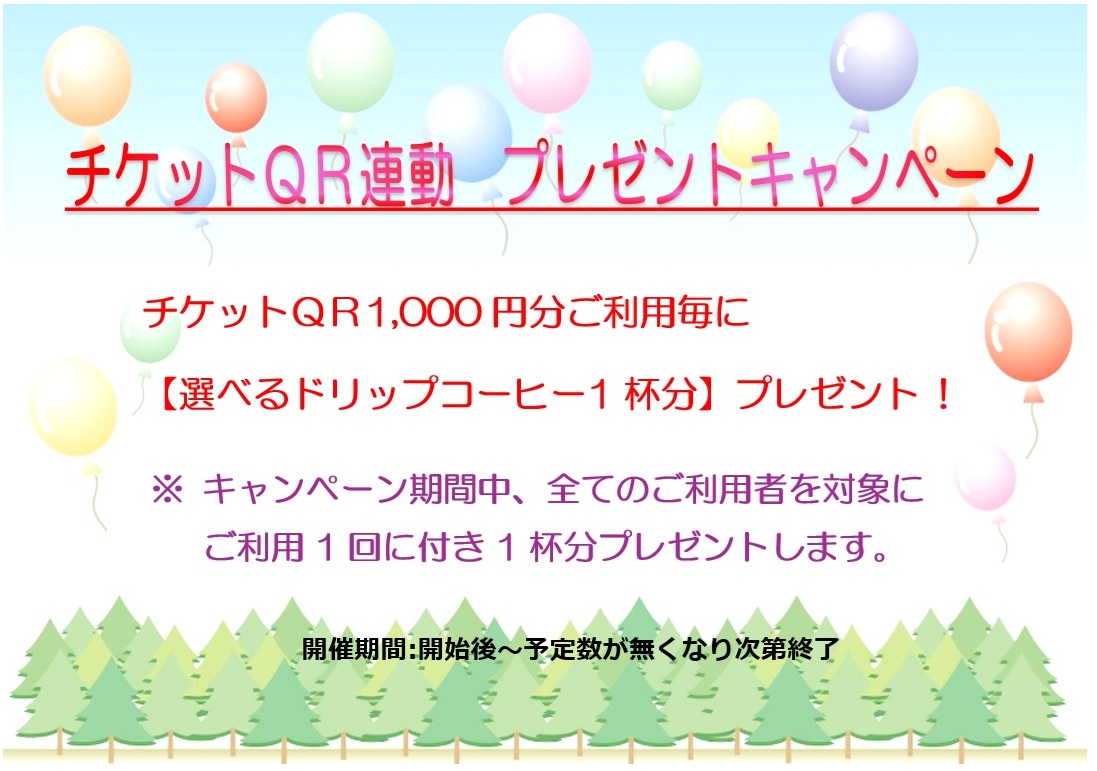 チケットQR1,000円分ご利用毎に【選べるドリップコーヒー1杯分】プレゼント !